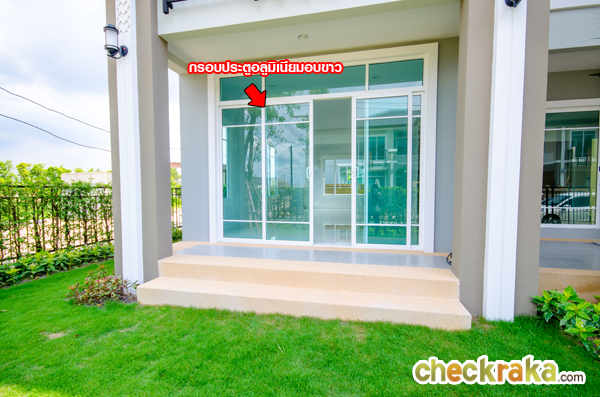 เปรียบเทียบกับบ้านเปล่ามาตรฐาน ประตูทางเข้าเป็นประตูบานเลื่อน กรอบประตูอลูมิเนียมอบขาว