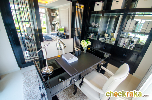 สำหรับบ้านตัวอย่างหลังนี้ตกแต่งห้องอเนกประสงค์เป็นห้องทำงาน ด้านข้างมีประตูบานเลื่อนเปิดออกไปข้างบ้านได้