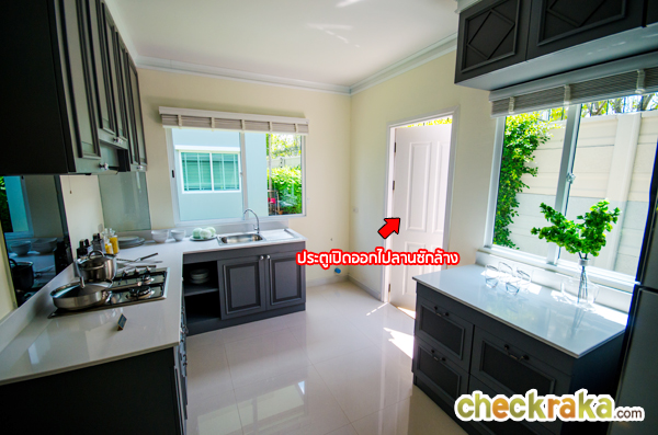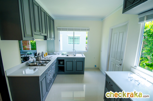 ห้องครัวบ้านที่ส่งมอบลูกค้าจะเป็นห้องเปล่าโล่งๆ ไม่มีเคาน์เตอร์มาให้ จะต่อท่อน้ำไว้ให้ ภายในครัวมีหน้าต่างให้ 2 บาน