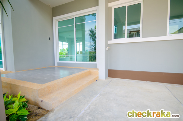 เฉลียงด้านหน้าบ้านจะยกสเต็ปขึ้นมาให้ 2 สเต็ปเพื่อความสะดวก ปูด้วยทรายล้างและกระเบื้องค่ะ