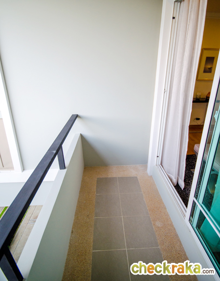 ระเบียงกว้างพอสมควร ยาวเท่ากับความกว้างของห้อง จะออกไปยืนชมวิวหรือวางกระถางปลูกต้นไม้ก็ได้