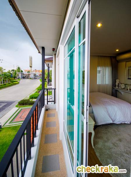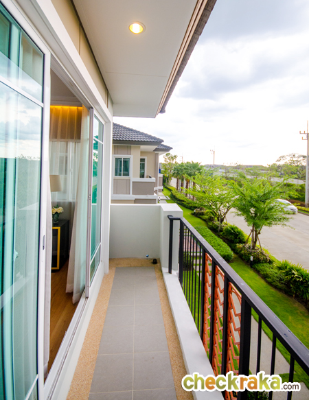 แต่ทันสมัย มีระเบียงด้านหน้า และดีไซน์สีตรงราวระเบียงให้ดูมีเส้นสายชัดเจนขึ้น ทำให้บ้านไม่เรียบจนเกินไป