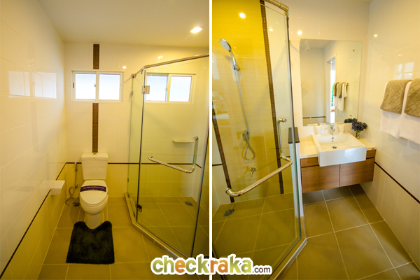 พื้นที่อาบน้ำแยกส่วนอย่างชัดเจนด้วยกระจกนิรภัย พร้อมฝักบัว