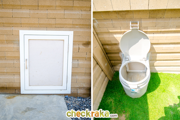 ตรงกำแพงหน้าบ้านติดตั้งถังขยะแบบฝังกำแพงมาให้เรียบร้อยแบบนี้เลย