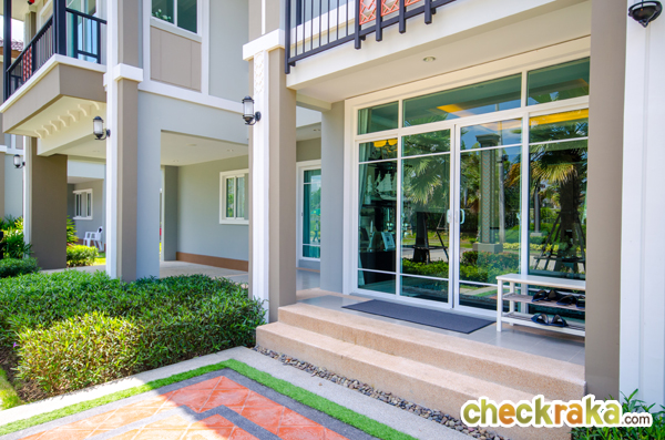 กลับมาที่บ้านตัวอย่างพร้อมตกแต่ง ตรงประตูทางเข้าหลักของบ้าน ตัวพื้นบ้านจะสูงขึ้นมาจากถนนและพื้นด้านนอก
