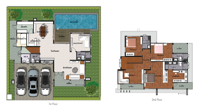 3. แบบบ้าน Blue Diamond - บ้านเดี่ยว 2 ชั้น ขนาดที่ดิน 92-153 ตร.ว. ขนาดพื้นที่ใช้สอย 390 ตร.ม. มีสระว่ายน้ำ 4 ห้องนอน 5 ห้องน้ำ ห้องรับแขก พักผ่อน พื้นที่รับประทานอาหาร ห้องครัว ห้องแม่บ้าน ที่จอดรถ 3 คัน