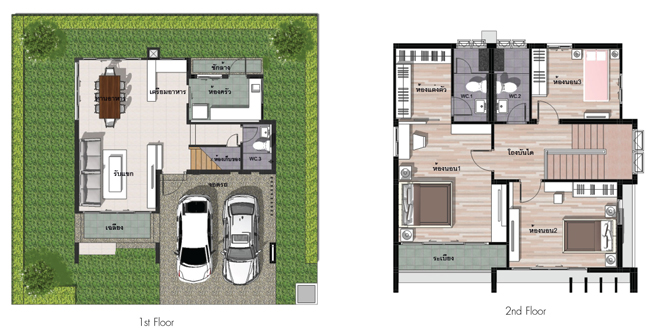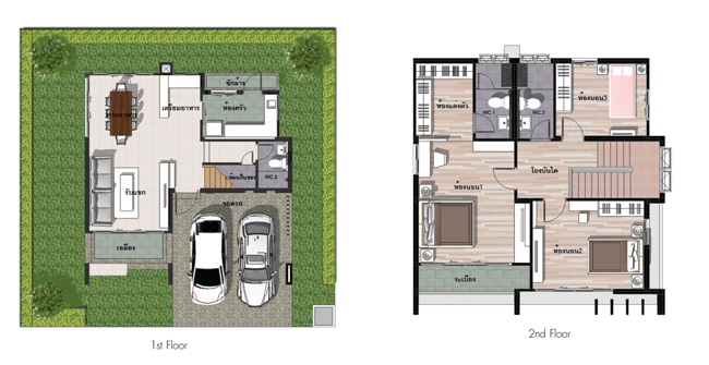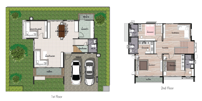 1. แบบบ้าน Blue Turqouise - บ้านเดี่ยว 2 ชั้น ขนาดที่ดิน 51-62 ตร.ว. ขนาดพื้นที่ใช้สอย 188 ตร.ม. 3 ห้องนอน 3 ห้องน้ำ มีพื้นที่รับแขกและรับประทานอาหาร ห้องครัว ที่จอดรถ 2 คัน