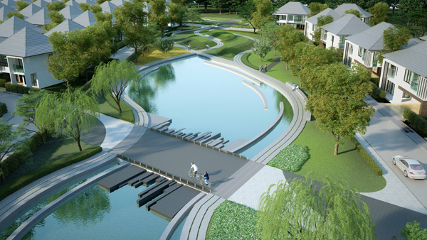 แสดงให้เห็นถึง ถนนภายในโครงการ บ้าน สวนสาธารณะ สะพาน และทางเข้า-ออก