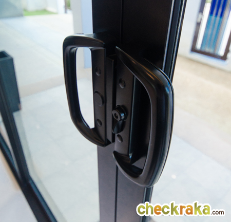กรอบประตูอลูมิเนียมสีดำ และกระจกเขียวตัดแสงทั้งหลัง
