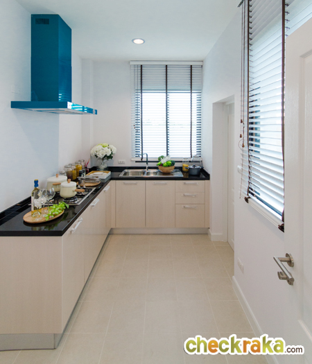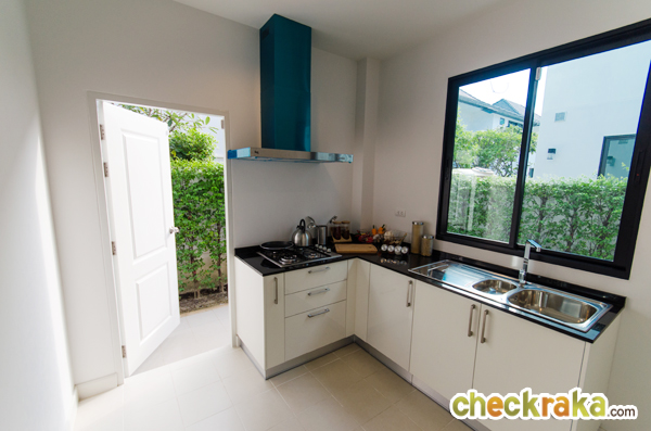 สำหรับห้องครัวบ้านที่ส่งมอบลูกค้าจะเป็นครัวบิวท์อิน แบบนี้เลยค่ะ มีเคาน์เตอร์มาให้ มีซิงค์ล้างจาน Top หินแกรนิต Hob/Hood ภายในครัวมีหน้าต่างให้ 1 บานเพื่อเปิดระบายอากาศ ครัวที่นี่เป็นครัวแยก มีประตูปิดให้ชัดเจน