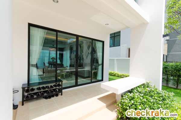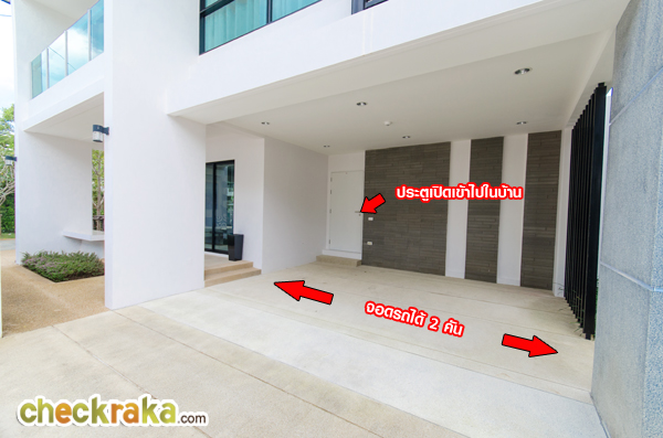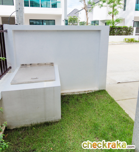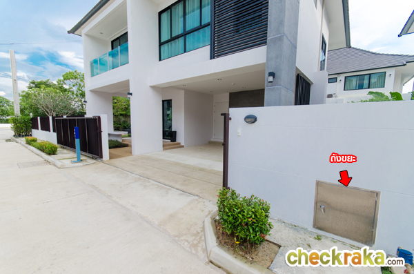 ความสูงของรั้วระหว่างบ้านอยู่ที่ 1.8 เมตร มีถังขยะแบบฝังกำแพงอยู่ ประตูหน้าบ้านเป็นประตูบานเลื่อนเหล็กทาสี