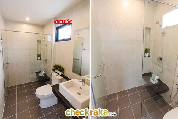 ติดๆกันคือห้องน้ำชั้นบน ใช้แชร์กันระหว่างห้องนอน 3 กับห้องนอน 2 มีสุขภัณฑ์ให้ครบ ส่วนกระจกกั้นแยกส่วน