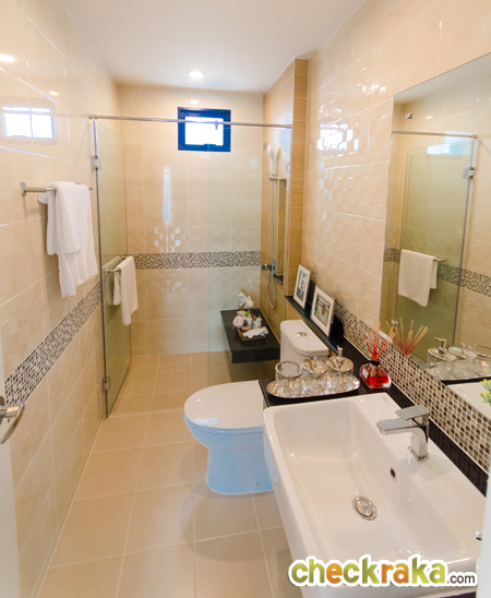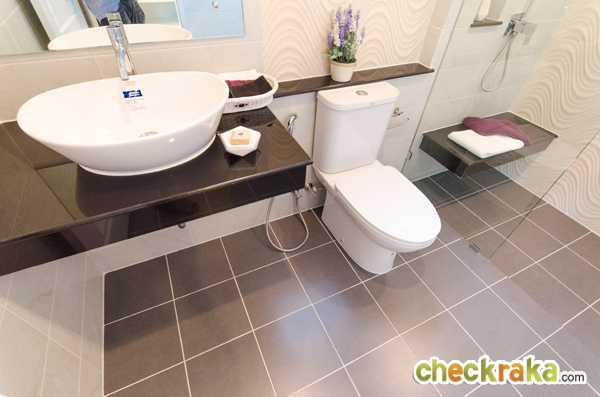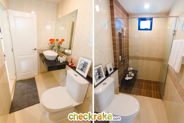 พื้นหน้าห้องน้ำลดระดับลง 2 ขั้นอย่างเห็นได้ชัด ส่วนพื้นห้องน้ำก็ลดลงอีกระดับ เผื่อว่าเวลาทำความสะอาดห้องน้ำ