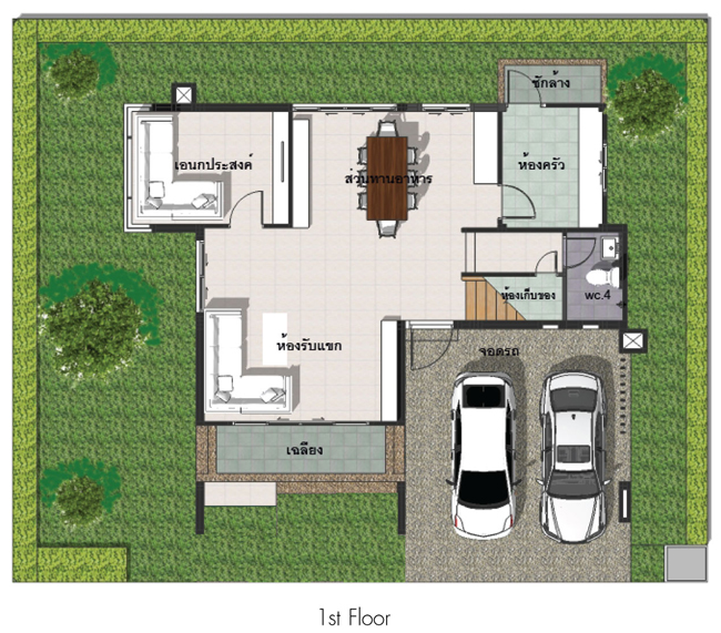 ชั้น 1 ประกอบไปด้วย ที่จอดรถ 2 คัน ด้านหน้าฝั่งซ้ายมือคือเฉลียงหน้าบ้าน ถัดไปคือส่วนพักผ่อน รับแขก ห้องซ้ายมือคือห้องอเนกประสงค์ที่ปรับเปลี่ยนเป็นห้องนอนที่ 4 ได้ ส่วนรับประทานอาหารวางตัวตรงกลาง ถัดจากส่วนรับประทานอาหารด้านขวาคือห้องครัวปิด มีประตูเปิดออกไปลานซักล้างหลังบ้าน จากนั้นติดกันเป็นห้องน้ำ และบันไดทางขึ้นชั้น 2