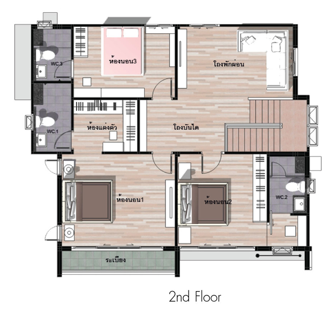 มาดูแปลนชั้น 2 กันค่ะ ขึ้นบันไดมาเจอกับโถงพักผ่อน ติดกับโถงพักผ่อนคือห้องนอนที่ 3 วางตัวอยู่ส่วนหลังบ้าน ถัดมาเป็น Master Bedroom มีระเบียงให้ด้วยวางตัวอยู่ด้านหน้าบ้าน และติดกับห้อง Master คือห้องนอน 2 ค่ะ