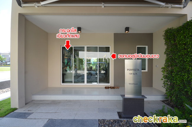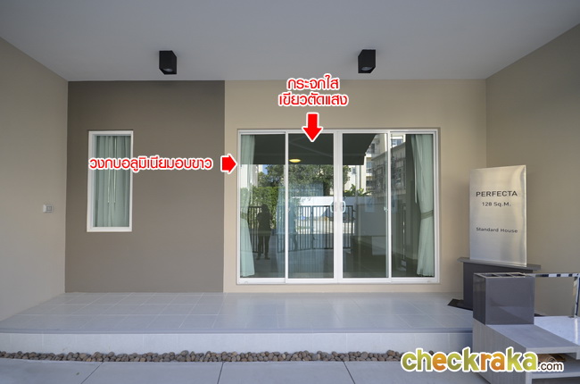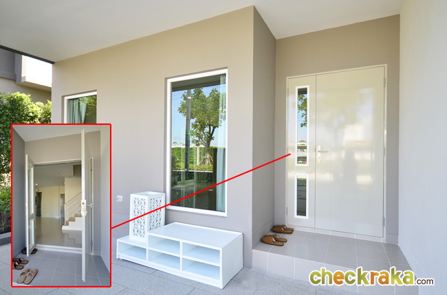 หน้าบ้านทำสเต็ปยกสูงขึ้น ประตูทางเข้าเป็นบานเลื่อนวงกบอลูมิเนียมอบขาว กระจกใสเขียวตัดแสง