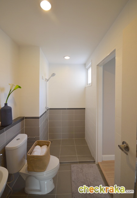 ห้องน้ำชั้นบน แบ่งส่วนแห้งส่วนเปียก กั้นด้วยธรณียกสูง ด้านข้างมีหน้าต่างระบายอากาศ