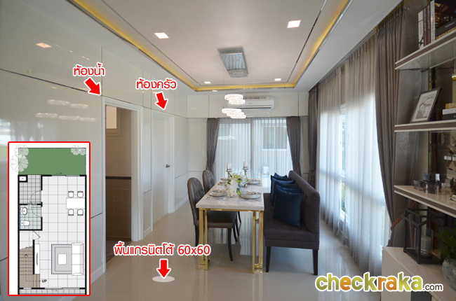 บริเวณห้องรับแขกและพื้นที่รับประทานอาหาร พื้นบ้านชั้นแรกเป็นแกรนิตโต้ 60x60 cm