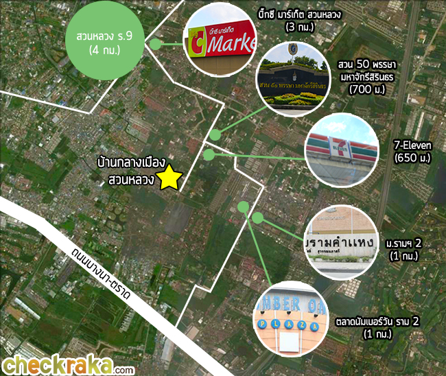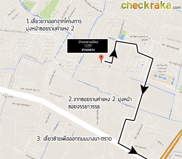 - ทำเลที่ตั้ง - บ้านกลางเมือง สวนหลวง ตั้งอยู่ในซอยชุมชนมหาดไทย 3 ใกล้กับมหาวิทยาลัยรามคำแหง (2) วิทยาเขตบางนา และสวนหลวง ร.9 ซึ่งพื้นที่ในโซนนี้ส่วนใหญ่ยังเป็นที่ว่างๆ รอการพัฒนา มีบ้านพักอาศัยและหอพักอยู่ประปราย บรรยากาศคึกคักพอสมควรค่ะ เพราะไม่ไกลจากมหาวิทยาลัยเท่าไร มีตลาดขนาดใหญ่ที่เป็นศูนย์รวมสินค้าอุปโภคบริโภคอย่างตลาดนัมเบอร์วัน ราม 2 สองข้างทางระหว่างเดินทางไปโครงการก็มีร้านอาหารและร้านสะดวกซื้อ นอกจากนี้ยังใกล้แหล่งห้างสรรพสินค้าชั้นนำอย่าง Mega บางนา, Paradise Park ศรีนครินทร์ ทำให้สะดวกต่อการ Shopping และจับจ่ายซื้อของได้เป็นอย่างดีทีเดียวค่ะ