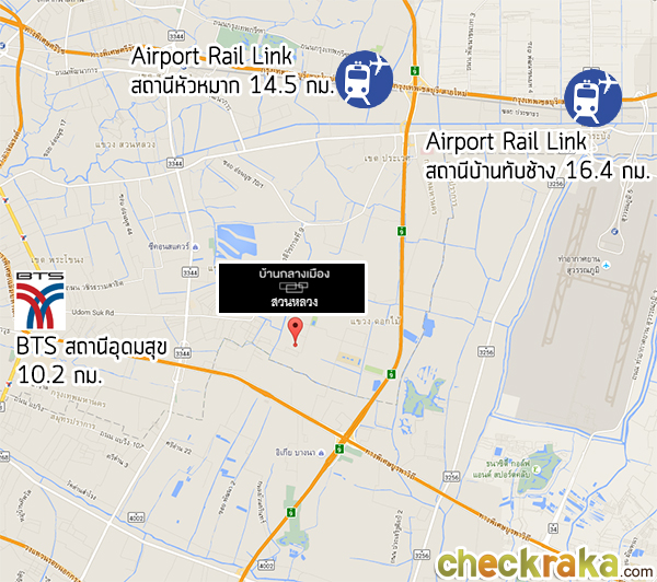 การเดินทางด้วยรถไฟฟ้า BTS สถานีที่ใกล้โครงการที่สุด คือ สถานีอุดมสุข (ระยะทางห่างจากโครงการประมาณ 10.2 กม.) ส่วน Airport Rail Link สามารถใช้ได้ 2 สถานีค่ะ คือ สถานีหัวหมาก (ระยะทางห่างจากโครงการประมาณ 14.5 กม.)