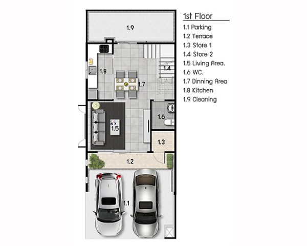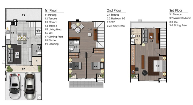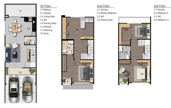 1) แบบบ้าน METRO - ทาวน์โฮม 3 ชั้น หน้ากว้าง 5 เมตร ขนาดที่ดินเริ่มต้น 19.40 ตารางวา มีพื้นที่ใช้สอย 175 ตารางเมตร ประกอบไปด้วย 3 ห้องนอน 3 ห้องน้ำ 1 พื้นที่รับแขก 1 ห้อง Family ห้องครัว และจอดรถได้ 2 คัน
