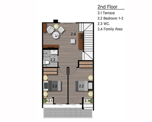 ขึ้นมาที่ชั้น 2 จะพบกับห้องน้ำ, Family Area และห้องนอน 1, 2 พื้นชั้น 2 เป็นลามิเนตหนา 8 มม.