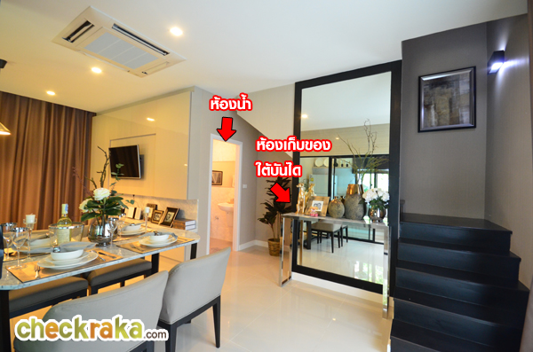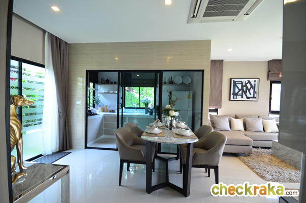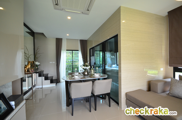 โต๊ะรับประทานอาหารจะวางตัวอยู่หน้าห้องครัว ประตูครัวเป็นประตูบานเลื่อน เปิด-ปิดเก็บกลิ่นควันได้ดีกว่าประตูแบบปกติ