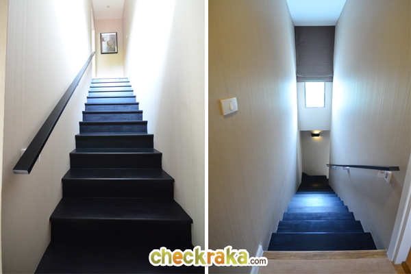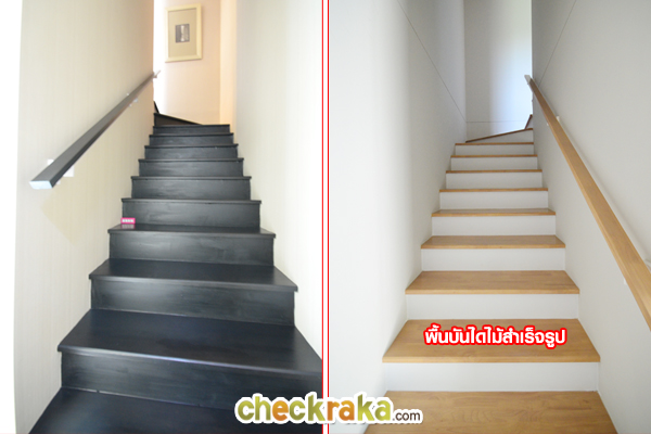 จบชั้นล่างแล้วเราขึ้นบันไดไปชั้นสองกันต่อค่ะ ฝั่งซ้ายคือบันไดบ้านตัวอย่างพร้อมตกแต่ง ฝั่งขวาคือบันไดแบบบ้านเปล่า บันไดที่นี่โครงสร้างคอนกรีตเสริมเหล็ก พื้นบันไดไม้สำเร็จรูปสีตามลามิเนต บันได มีชานพัก 2 จุด