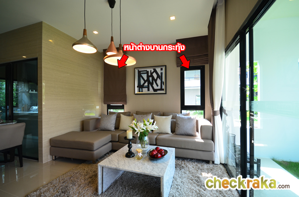 ส่วนแรกที่เปิดประตูเข้ามาเห็นเลยคือส่วนรับแขก วางโซฟารับแขกตัว L ได้นะคะ ด้านหลังเป็นหน้าต่างบานกระทุ้ง