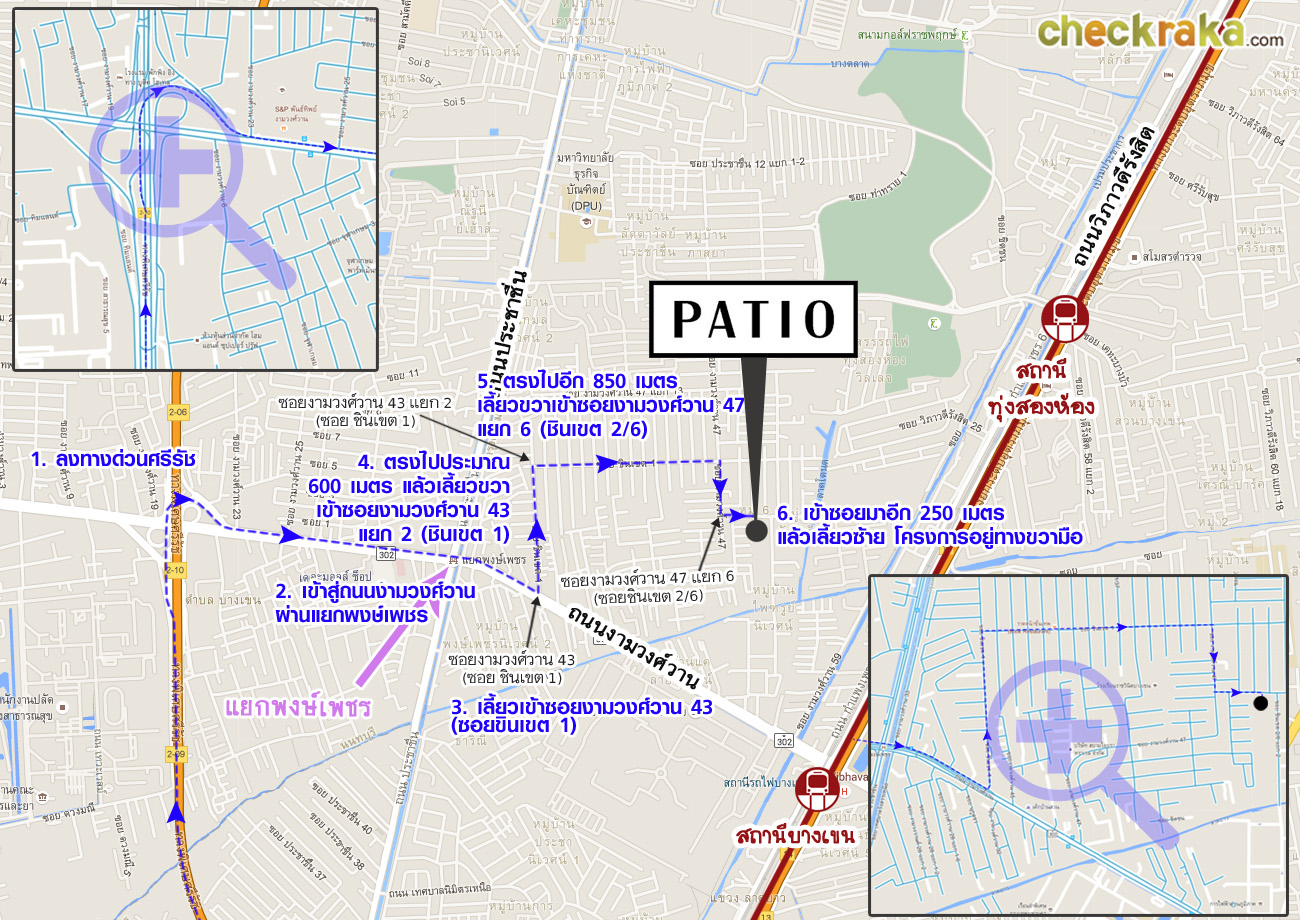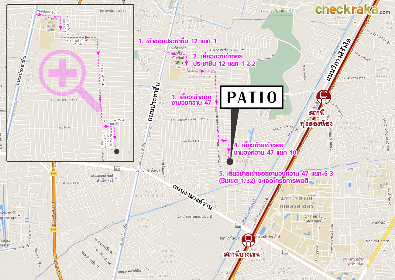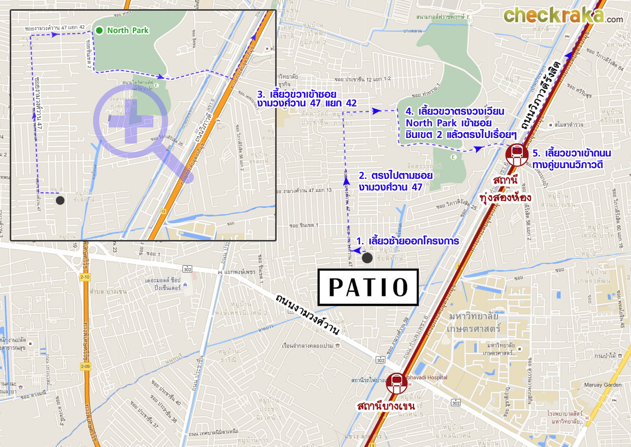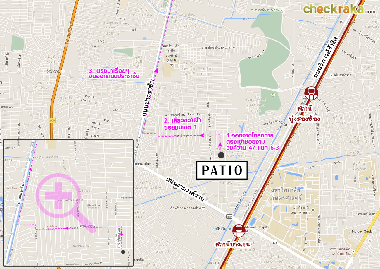 เลี้ยวซ้ายเข้าซอยงามวงศ์วาน 47 แยก 6 (ซอยชินเขต 2/6) ตรงหัวมุมมีป้ายบอกทางไปโครงการ