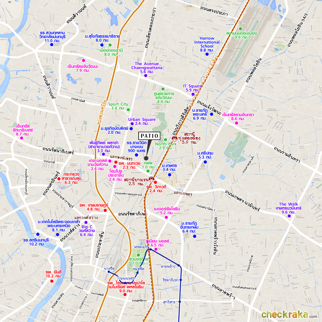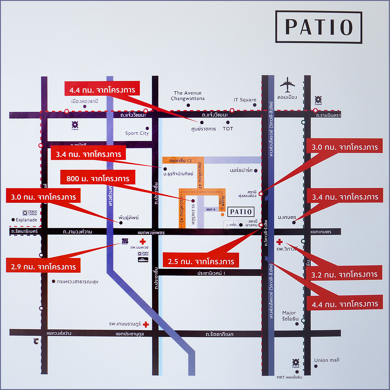 แผนที่แสดงระยะห่างโครงการ กับ รถไฟฟ้าสายสีแดง ช่วงบางซื่อ - รังสิต