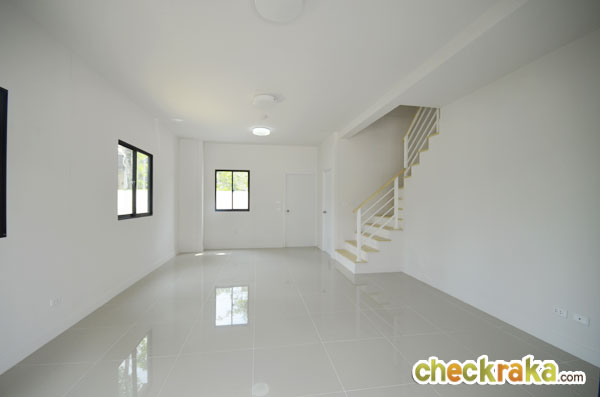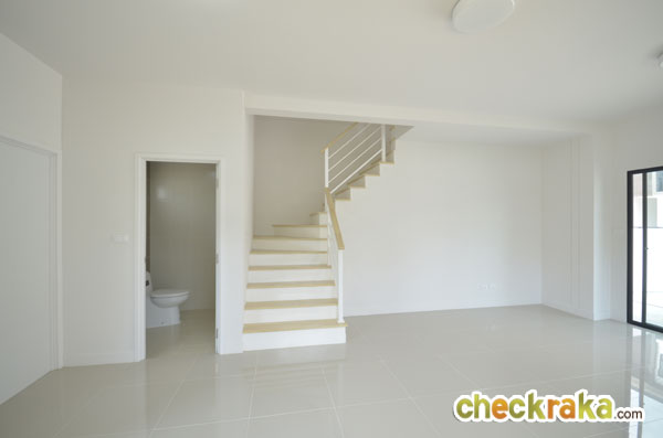 เข้ามาด้านในตัวบ้าน ส่วนแรกถูกจัดเป็นส่วนพักผ่อน รับแขก บ้านเปล่ามาตรฐาน พื้นชั้นล่างปูด้วยกระเบื้องแกรนิตโต้ขนาด 60 x 60 ซม. บ้านที่นี่มีความสูงจากพื้นถึงเพดาน 2.75 เมตร ฝ้าที่ให้คือฝ้าเรียบ ไฟด้านล่างเป็นไฟซาลาเปานะคะ