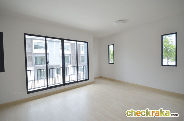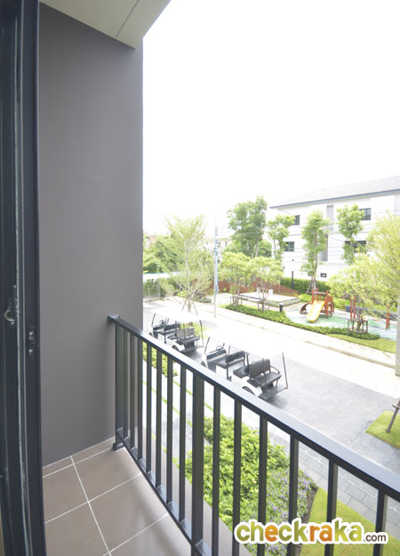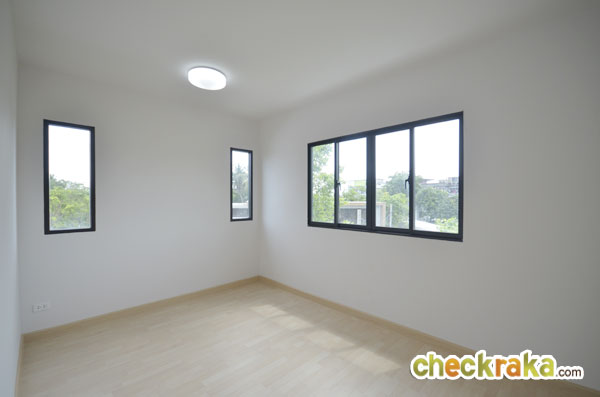 สังเกตเห็นว่าประตูและหน้าต่างบานใหญ่มีทุกชั้น เน้นเรื่องแสงภายในบ้าน บ้านเปล่าที่ขายจริงจะมีรั้วเหล็กโปร่งสีดำ