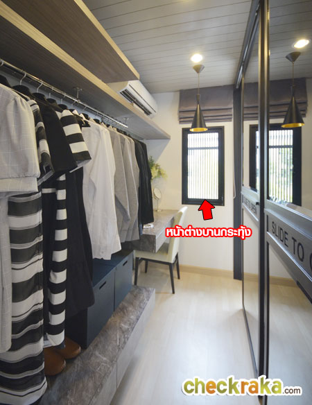 ส่วนที่จัดวาง Walk in closet มองตรงไปจะมีหน้าต่างบานกระทุ้ง เปิดออกไปได้ ข้างนอกมีพื้นที่สำหรับวาง