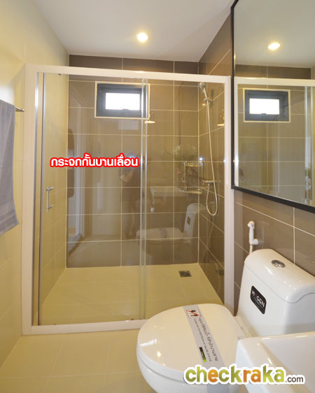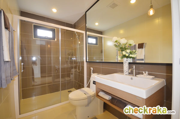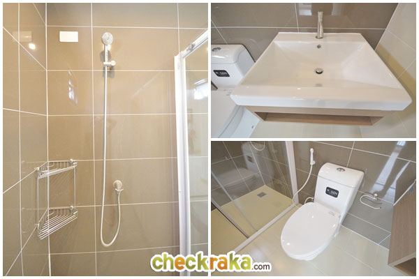 และฝักบัว นอกจากนี้ยังแยกส่วนเปียก/แห้ง ให้อย่างชัดเจนด้วยกระจกกั้นบานเลื่อน และติดพัดลมดูดอากาศมาให้เลย