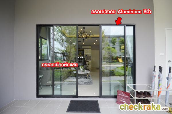 ประตูทางเข้าหลักเป็นประตูบานเลื่อนคู่ กระจกเขียวตัดแสง กรอบประตูอลูมิเนียมสีดำ