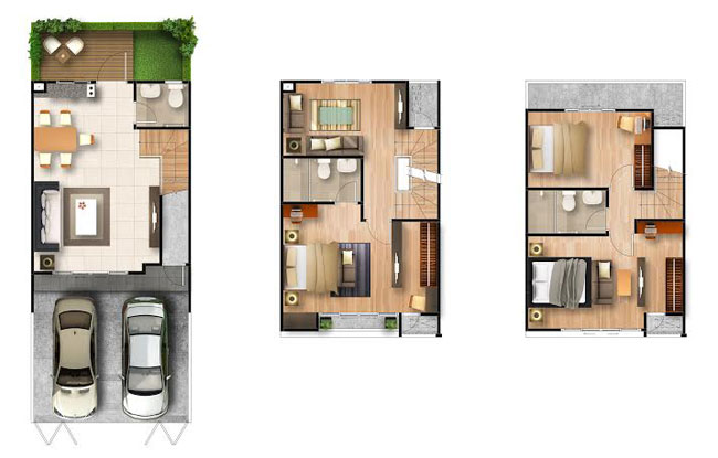 มาดูแบบบ้านในแต่ละชั้นกันค่ะว่ามีอะไรบ้าง ชั้น 1 เปิดประตูรั้วเข้ามาเลยจะเจอกับลานจอดรถ พอเข้ามาในตัวบ้านส่วนแรกคือพื้นที่รับแขก ถัดจากส่วนรับแขกเป็นส่วนโต๊ะรับประทานอาหาร และ Pantry ถัดจากนั้นเป็นประตูเปิดออกไปส่วนซักล้างหลังบ้าน ห้องน้ำชั้นล่างจะอยู่ตรงข้ามกับส่วนรับประทานอาหาร และบันไดทางขึ้นชั้น 2 อยู่ติดกับห้องน้ำค่ะ ชั้น 2 ขึ้นบันไดมาจะเป็น Master Bedroom มีระเบียงส่วนตัว และห้องน้ำในตัวให้ วางตัวอยู่ฝั่งหน้าบ้าน ส่วนฝั่งหลังบ้านเป็น Family Room ชั้น 3 เป็นพื้นที่ของห้องนอนอีก 2 ห้องที่เหลือ ห้องฝั่งหน้าบ้านมีขนาดพอๆ กับห้อง Master Bedroom ส่วนห้องฝั่งหลังบ้านเป็นห้องนอนเล็ก ชั้นนี้ใช้ห้องน้ำแชร์กันค่ะ