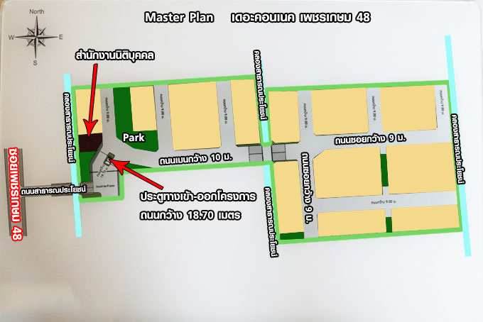 แสดงให้เห็นถึงแบบแปลนโครงการ บ้าน สวนสาธารณะ และทางเข้า-ออก