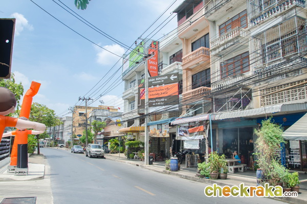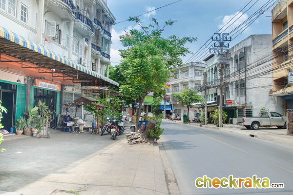 ภาพบรรยากาศถนนด้านหน้าโครงการ ฝั่งตรงข้ามเป็นตึกแถวบ้านเรือน และร้านค้า