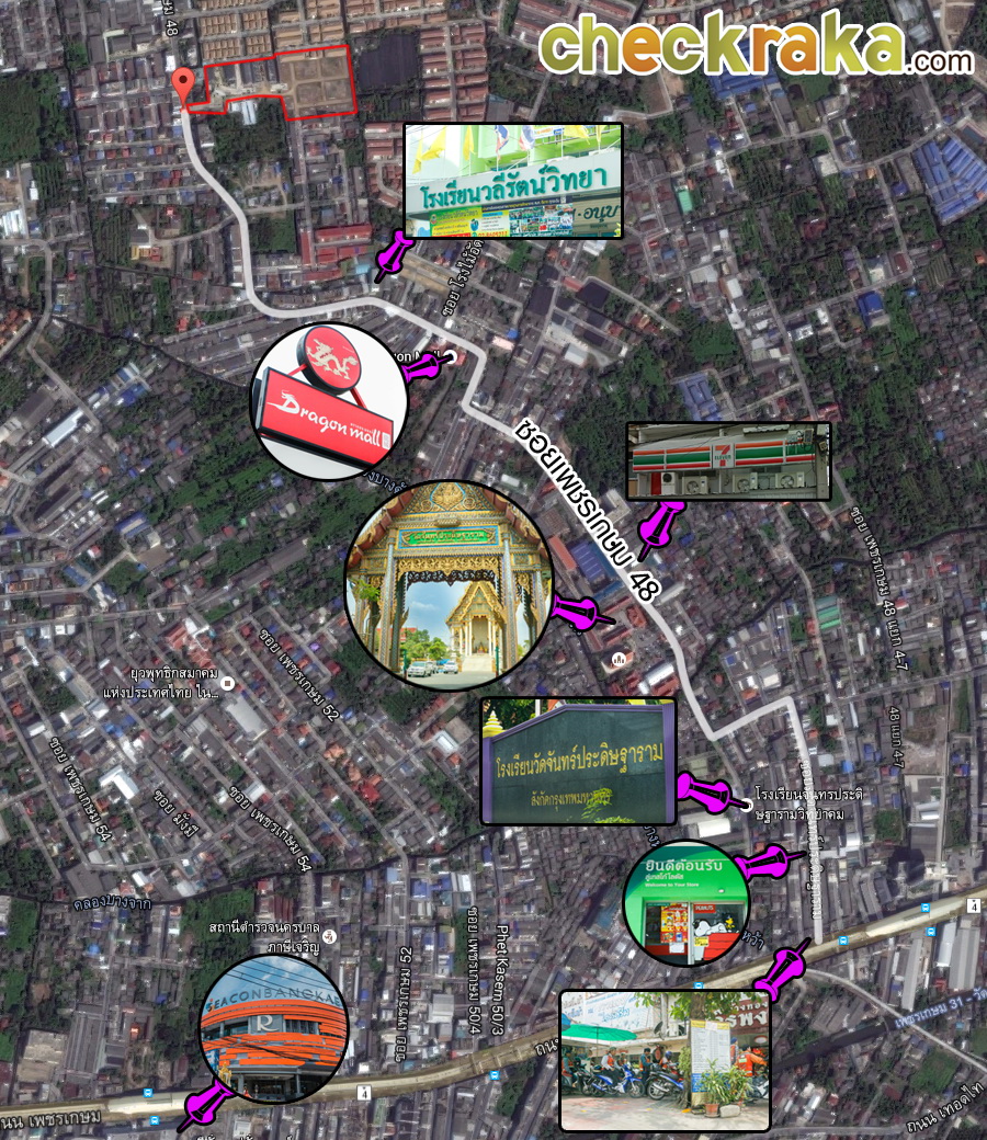 โครงการตั้งอยู่ในซอยเพชรเกษม 48 ซึ่งอยู่ห่างจากถนนหลักเพชรเกษมประมาณ 2.0 กม. ภายในซอยมีลักษณะเป็นชุมชน ตึกแถวตั้งเรียงราย เปิดเป็นร้านค้าบ้าง บ้านเรือนบุคคลทั่วไปบ้าง มี Tesco Lotus กับ 7-11 และมีสถานที่สำคัญ เช่น วัดจันทร์ประดิษฐาราม, โรงเรียนวัดจันทร์ประดิษฐารามวิทยาคม, Dragon Mall เป็นต้น นอกจากนี้ในระยะใกล้เคียงโครงการยังมีร้านอาหารเล็กๆ คอยเปิดบริการอีกด้วยค่ะ
