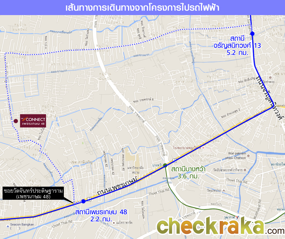 บริษัทฯ ขอสงวนสิทธิ์ในการเปลี่ยนแปลงเงื่อนไขราคา, อัตราการผ่อนชำระและรายการส่งเสริมการขาย โดยมิต้องแจ้งให้ทราบล่วงหน้า** ทำสัญญาภายใน 7 วัน นับจากวันจอง ค่าธรรมเนียมโอนกรรมสิทธิ์ ผู้ซื้อและผู้จะขายออกเท่ากันทั้งสองฝ่าย ค่าธรรมเนียมจดจำนอง 1% ของวงเงินกู้ ผู้ซื้อเป็นผู้ชำระ ค่าใช้จ่ายในการขอติดตั้งมิเตอร์ไฟฟ้าและมิเตอร์น้ำ ผู้ซื้อเป็นผู้ชำระ ค่าบริการสาธารณะ ชำระในวันโอนกรรมสิทธิ์ 50 บาท/เดือน (ชำระล่วงหน้า 3 ปี) การขอสินเชื่อกับสถาบันการเงิน ทางสถาบันการเงินเป็นผู้พิจารณาอนุมัติหรือไม่ ขึ้นกับเงื่อนไขของสถาบันการเงินและคุณสมบัติของตัวผู้กู้เป็นสำคัญ ที่ดินเพิ่ม-ลดตารางวาละ 85,000 บาท ทำเลที่ตั้ง และการเดินทาง - โครงการตั้งอยู่ในซอยเพชรเกษม 48 ถนนเพชรเกษม แขวงบางด้วน เขตภาษีเจริญ กรุงเทพมหานคร ตัวโครงการอยู่ห่างจากถนนหลักเพชรเกษมประมาณ 2.0 กม. สามารถเดินทางเข้าออกโครงการได้ด้วยรถยนต์ โดยเส้นทางเข้า - ออก หลักของโครงการนั้นมีถึง 4 เส้นทางด้วยกัน คือ ถนนเพชรเกษม, ถนนราชพฤกษ์, ถนนพุทธมณฑลสาย 1, และถนนจรัญสนิทวงศ์ สำหรับถนนเพชรเกษมนั้น สามารเข้าซอยเพชรเกษม 48 หรือซอยวัดจันทร์ประดิษฐารามได้เลย จากปากซอยสามารถใช้บริการวินมอเตอร์ไซค์ได้ในอัตราค่าบริการประมาณ 15-20 บาท หากมาจากถนนราชพฤกษ์ ให้ตรงมาเรื่อยๆ จนเข้าถนนบางแวกแล้วเข้าซอยวัดจันทร์ประดิษฐาราม โดยตัวโครงการจะห่างจากถนนบางแวกประมาณ 1.1 กม. เส้นทางที่สามคือถนนพุทธมณฑลสาย 1 เส้นนี้ก็สามารถมาเชื่อมต่อกับถนนบางแวกแล้วเข้าซอยวัดจันทร์ประดิษฐารามได้ และหากมาทางถนนจรัญสนิทวงศ์ ให้มองหาซอยเลขคี่บริเวณซอยจรัญสนิทวงศ์ 11 แล้วเลี้ยวเข้าถนนพาณิชยการธนบุรี ซึ่งจะไปเชื่อมต่อกับถนนบางแวก แล้วเลี้ยวซ้ายเข้าซอยวัดจันทร์ประดิษฐารามได้เช่นกัน นอกจากนี้ การเดินทางมายังโครงการสามารถเดินทางได้ด้วยรถไฟฟ้า BTS สถานีที่ใกล้โครงการมากที่สุดคือ สถานีบางหว้า มีระยะห่างจากโครงการประมาณ 3.6 กม. ซึ่งสามารถใช้งานได้แล้วในปัจจุบัน และยังมีรถไฟฟ้าสายสีน้ำเงินในอนาคตรองรับอีกด้วย ซึ่งปัจจุบันนี้ สายสีน้ำเงินนี้กำลังอยู่ในระหว่างก่อสร้าง คาดว่าจะเปิดให้ใช้บริการได้ประมาณเดือนกุมภาพันธ์ ปี 2562 โดยสถานีที่ใกล้โครงการมากที่สุดคือ สถานีเพชรเกษม 48 มีระยะห่างจากโครงการประมาณ 2.2 กม. โดยจะอยู่ด้านหน้าปากซอยของโครงการพอดี หรือสำหรับผู้ที่ใช้ถนนจรัญสนิทวงศ์ ก็สามารถใช้สถานีจรัญสนิทวงศ์ 13 ก็ได้เช่นกันค่ะ โดยมีระยะห่างจากโครงการประมาณ 5.2 กม. สภาพแวดล้อมรอบโครงการ - สภาพโดยรอบโ