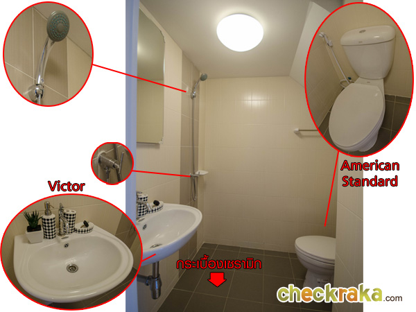 พื้นห้องน้ำเป็นพื้นกระเบื้องเซรามิก อ่างล้างหน้าของ Victor สุขภัณฑ์ของ American Standard
