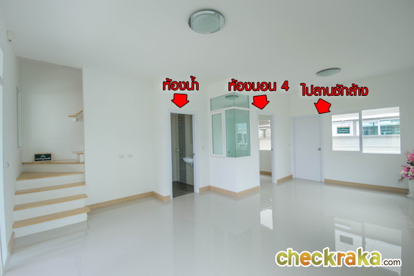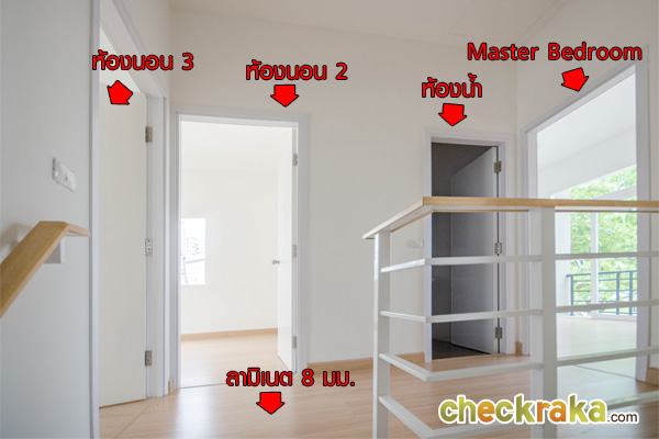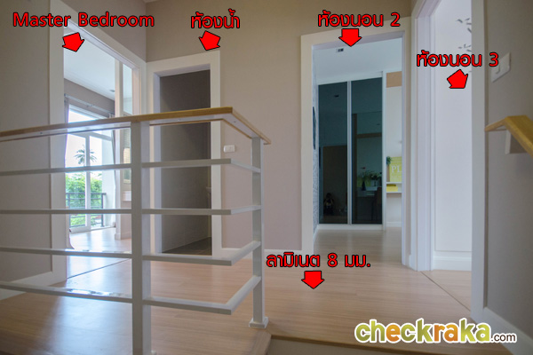 ชั้นบนประกอบด้วย 3 ห้องนอน 2 ห้องน้ำ (ห้องน้ำในตัว 1 ห้อง) พื้นเป็นไม้ลามิเนต หนา 8 มม.