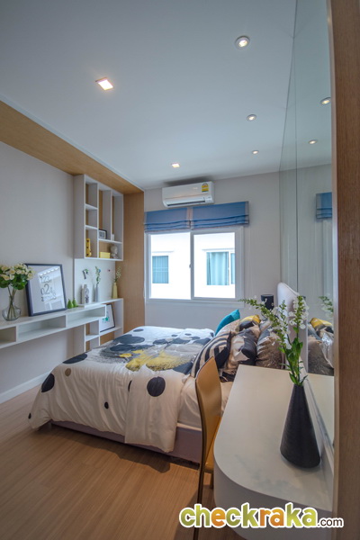 วางเตียงแล้วยังเหลือพื้นที่วางตู้เสื้อผ้า และทำโต๊ะหนังสือได้อยู่ค่ะ