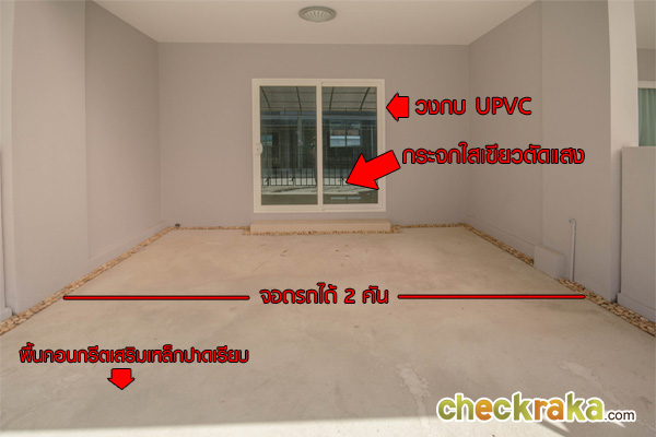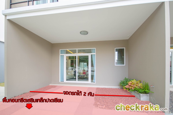 ด้านหน้าบ้านกว้าง 5.7 เมตร สามารถจอดรถได้ 2 คัน พื้นลานจอดรถเป็นพื้นคอนกรีตเสริมเหล็กปาดเรียบ