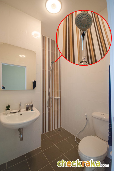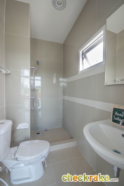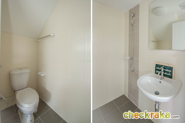 ห้องน้ำชั้นล่าง มีอุปกรณ์ให้ครบครันเช่นกัน โดยพื้นที่อาบน้ำ กับสุขภัณฑ์จะอยู่ใกล้ๆ กัน