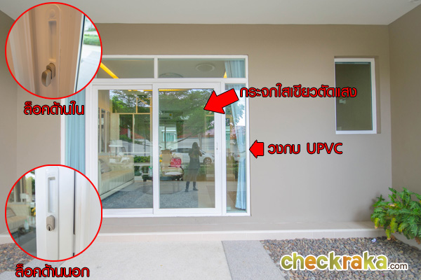 ประตูเป็นบานเลื่อนกระจกใสเขียวตัดแสง วงกบ UPVC