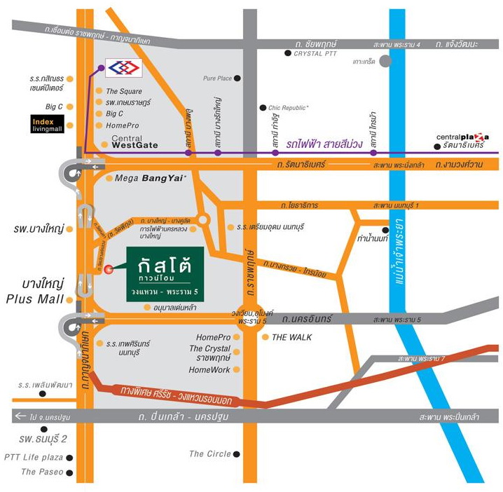 www.mrta-purpleline.com บรรยากาศรอบๆ โครงการมีความเป็นธรรมชาติ และสงบดีค่ะ เส้นทางรอบๆ โครงการก็สามารถเชื่อมกันได้หมด สามารถใช้ไปเชื่อมต่อกับถนนหลักในย่านนี้ได้หลายเส้น ภายในซอยรอบๆ โครงการก็จะมีร้านอาหาร, ร้านสะดวกซื้อ, ตลาด, โรงเรียน และโรงพยาบาล ตามแผนที่ด้านล่างค่ะ