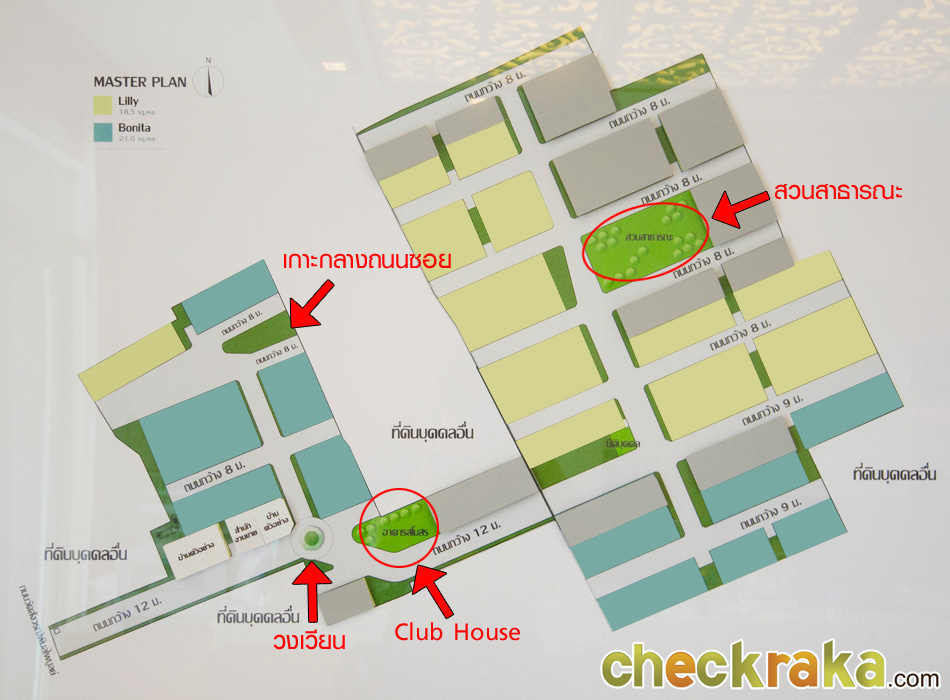 Master Plan แสดงตำแหน่งทางเข้า-ออกโครงการ ตำแหน่งบ้าน และคลับเฮ้าส์ (