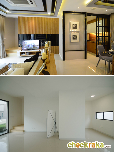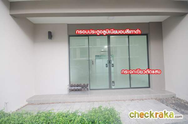 - แบบบ้านและวัสดุ - แบบบ้านเป็นทาวน์โฮม 3 ชั้น สามารถรองรับสมาชิกในครอบครัวได้หลายคน เพราะมีถึง 3 ชั้น ฟังก์ชั่นของบ้านก็สามารถตอบโจทย์สำหรับผู้ที่มีครอบครัวขนาดกลางได้เป็นอย่างดี เพราะมี 3 ห้องนอน สามารถปรับเปลี่ยนฟังก์ชั่นได้ตามใจ อย่างเช่นจะปรับห้องอเนกประสงค์เป็นห้องทำงาน ห้องโฮมเทียเตอร์ หรือห้องนอนก็ได้ ครัวด้านล่างปรับเป็นพื้นที่เตรียมอาหาร แต่ครัวที่ใช้ทำกับข้าวหนักๆ ก็ต่อเติมในส่วนหลังบ้านแทน ส่วนวัสดุภายในบ้าน เช่น สุขภัณฑ์ใช้ของ Cotto พื้นชั้นล่างเป็นแกรนิตโต้ 60x60 ซ.ม. พื้นชั้นบนเป็นลามิเนตหนา 8 มม. บานประตูห้องภายในเป็นประตูสำเร็จรูป กรอบประตูหน้าต่างเป็นอลูมิเนียมอบสีเทาดำ กระจกเขียวตัดแสงทั้งหลัง โดยรวมแล้ววัสดุและเกรดของวัสดุสมเหตุสมผลกับราคา